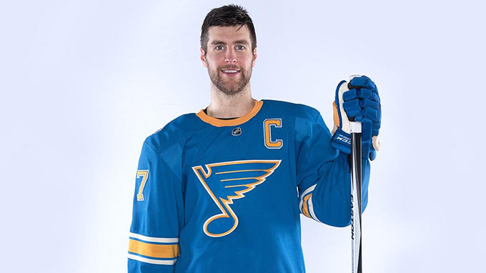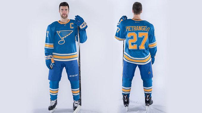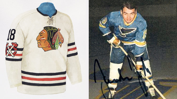 A pokud vám něco říká tvář na dobové fotografii, pak se nemýlíte. Ve stejné variantě dresu hráli Blues ještě i v době, kdy do NHL v sezóně 1969/70 naskočil Jaroslav Jiřík. Ač mu na focení daly špatné štulpny.